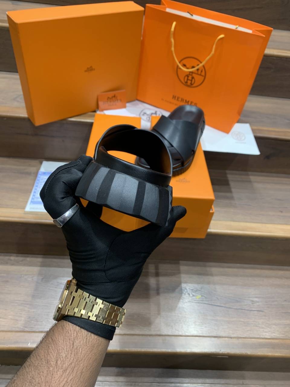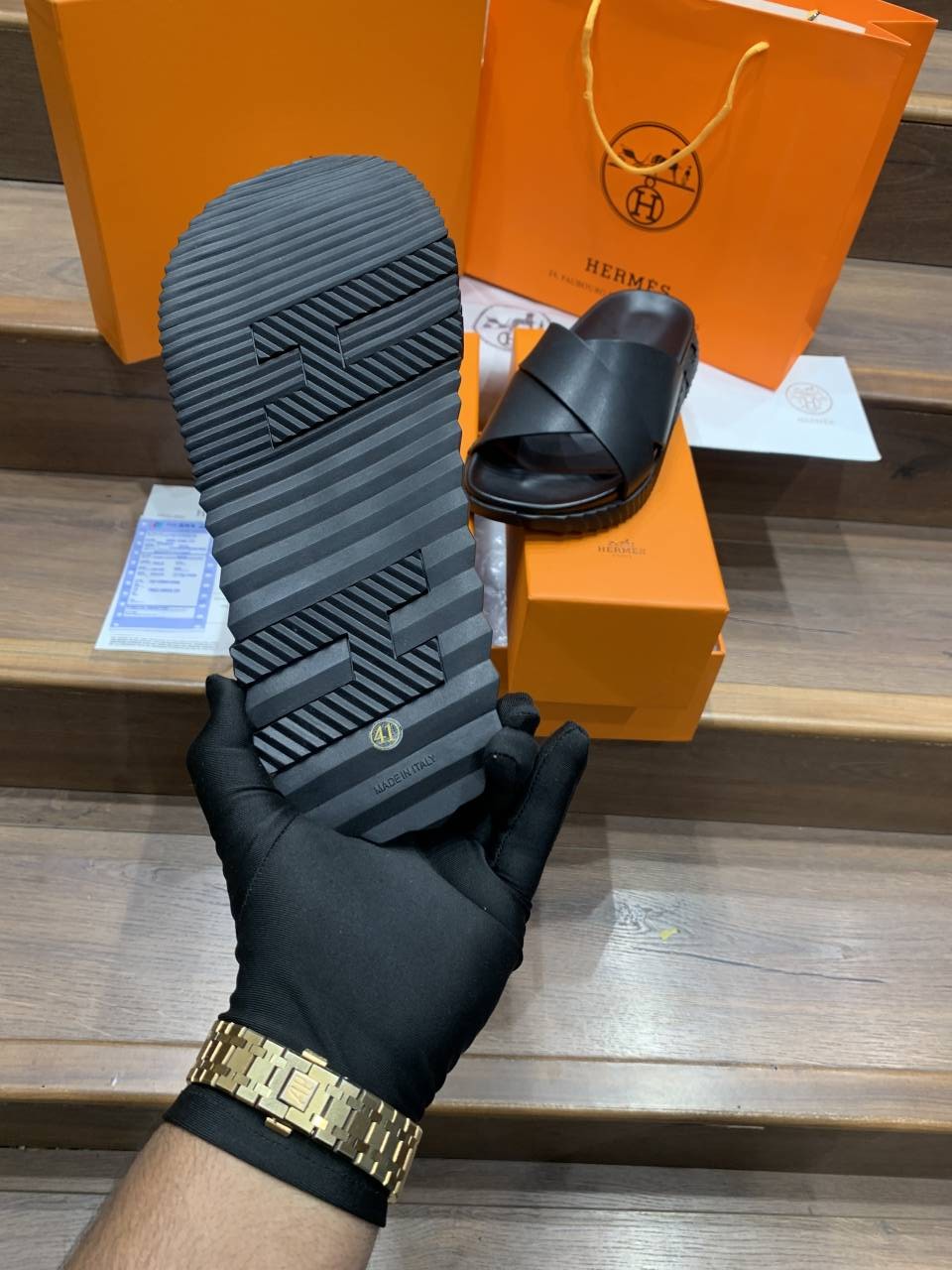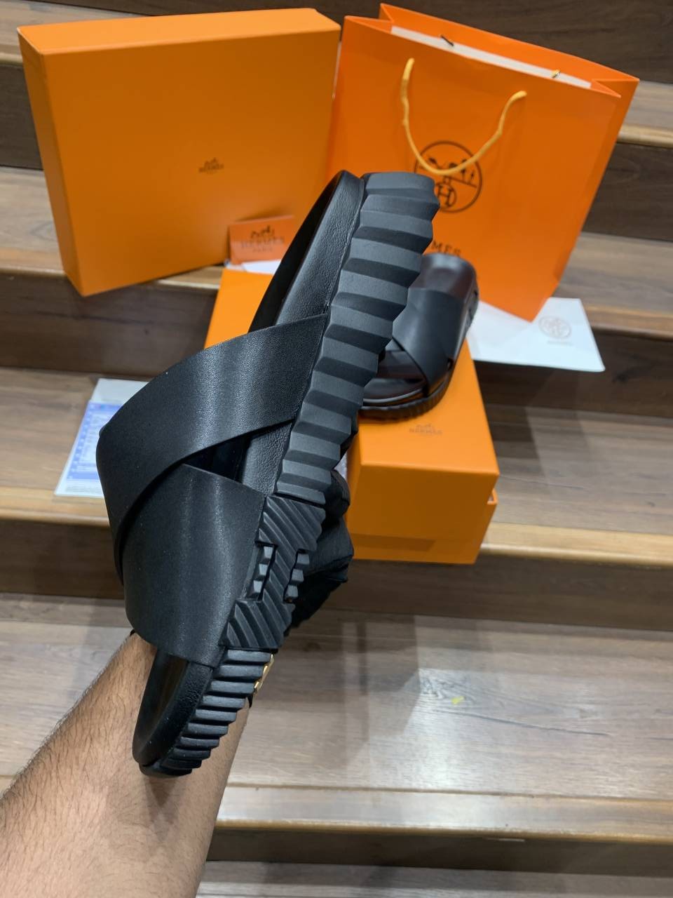 HERMES INFRA BLACK PREMIUM LEATHER SLIDE